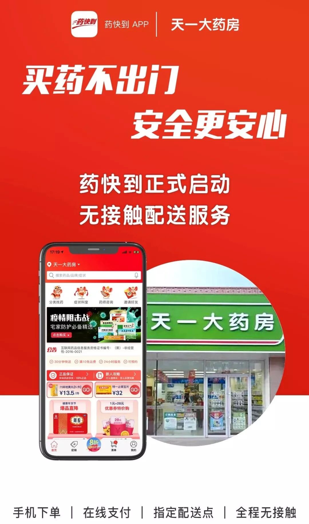 因受疫情影响,天一大药房原有电话送药上门服务暂停。结果导致大量群众在线下门店排队购买防疫用品。为此,在征得相关部门同意的情况下,天一大药房决定发挥网定店送的优势,联合药快到APP推出“无接触”配送服务,用户通过APP下单后,可以跟配送员沟通送到指定地点,货品送到后用户可自取,无需面对面,防止交叉感染,保障用户安全。