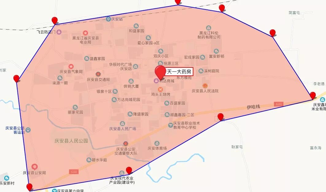 天一大药房门店覆盖周边三到五公里,基本实现了在庆安县城区的全覆盖。