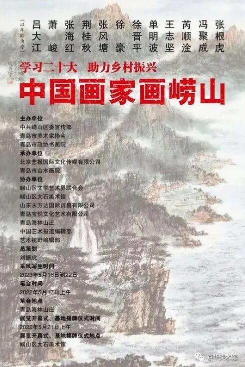 中国画家画崂山 主办单位: 中共崂山区委宣传部 青岛市美术家协会 青岛市政协书画院 承办单位: 北京艺报国际文化传媒有限公司 青岛市山水画院 协办单位: 崂山区文学艺术界联合会 崂山区大石美术馆 山东永方达国际贸易有限公司 青岛宝悦文化艺术有限公司 青岛海林山庄 中国艺术报道编辑部 艺术视野编辑部 总策划: 刘振虎 采风写生时间: 2023年5月16日到22日 笔会时间: 2023年5月17日上午 笔会地点: 青岛海林山庄 展览开幕式、基地揭牌仪式时间: 2023年5月21日上午 展览开幕式、基地揭牌仪式地点: 崂山区大石美术馆 画家邀请名单(以年龄为序,排名不分前后): 张根虎:山西中国画学会会长、中国美协会员、中国书协会员 冯聚成:山东省美协山水画艺委会副秘书长、中国美协会员 芮顺淦:浙江金华美协主席、中国美协会员 王志坚:湖南湘潭美协名誉主席、中国美协会员 单明波:中国美协会员、山东青岛山水画院院长 徐晋平:山西美协副主席、中国美协会员 徐豪:安徽财经大学教授、中国美协会员 张风塘:青岛美协主席、青岛画院院长、中国美协会员、中国书协会员 荆桂秋:黑龙江美协副主席、黑龙江省书画院副院长 张海红:青海画院副院长、青海省山水画研究院院长、中国美协会员、青海西宁美协主席 萧峻:中国美协会员、中国书协会员 吕大江:中国美协会员、首都博物馆画院执行副院长